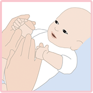 Dùng một tay nhẹ nhàng nắm lấy mắt cá chân của bé. Đặt tay kia lên trên đùi của bé, nắm xoay xung quanh chân rồi trượt tay xuống mắt cá chân. Lặp lại thao tác xoa bóp theo nhịp điệu, chắc mà vẫn nhẹ nhàng, tay này sang tay kia.